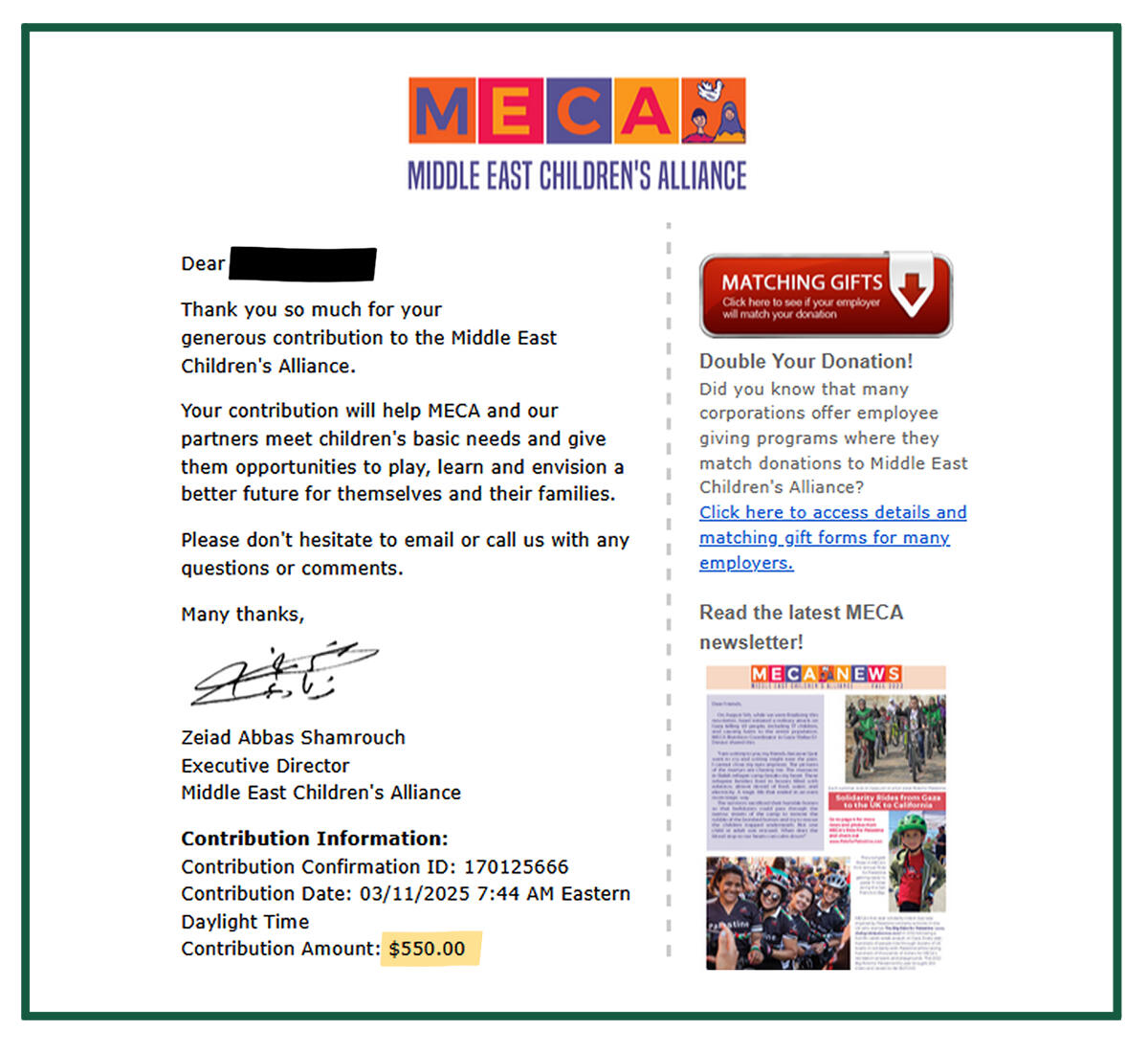 The Middle East Children’s Alliance (MECA) is a nonprofit humanitarian aid organization based in Berkeley, California, supporting children and families in Palestine, Iraq and Lebanon in the form of direct aid, financial aid and education.If you wish to know more about the charity, or would like to donate to the cause, you can visit their website, linked below.